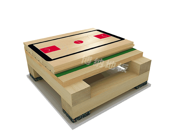 雙層龍骨斜鋪結構采用LVL或實木龍骨整體懸浮式安裝,完全符合德國DIN標準,用特定螺栓連接上下龍骨及彈性墊,在上下龍骨之間加彈性墊,解決了龍骨因接觸產(chǎn)生的異響,并且大大提高了運動性能。(LVL龍骨是上新型的更高技術含量的抗變形結構,不僅提高了木方的抗彎抗剪性,還大大提高了木方的彈性模量)